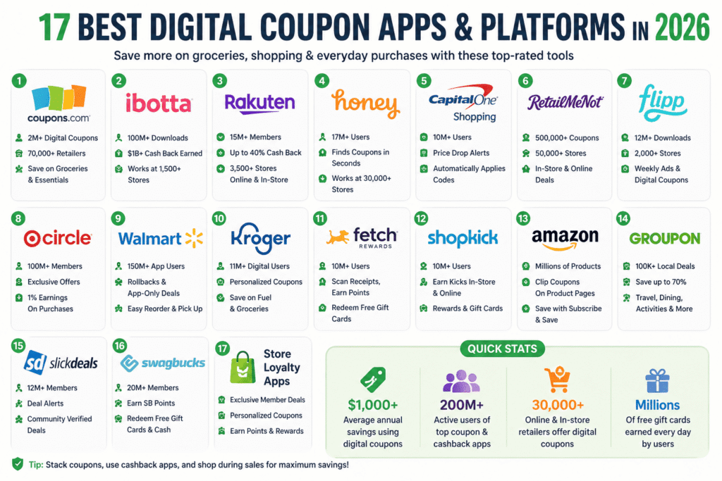The best digital coupons to use in 2026 come from trusted apps, cashback platforms, browser extensions, and store loyalty programs. These tools help families save money on groceries, online shopping, clothing, and everyday household purchases. Using a few reliable digital coupon platforms each week can significantly reduce monthly shopping costs.
